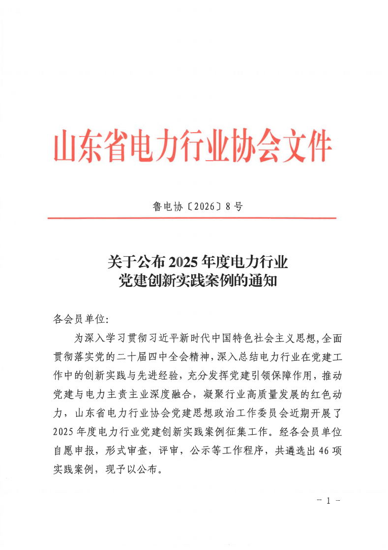 近日,山东省电力行业协会公布“2025年度电力行业党建创新实践案例”名录,公司推送的《打造特色“九廉”文化 擦亮清风铁军廉洁底色》《党建引领 人才赋能 助力电网业务高质量发展》及《“五维融合”工作法赋能世界最大压缩空气储能电站建设》三项党建创新成果成功入选。 下一步,公司各部门单位将在公司党委的坚强领导下,紧紧围绕公司改革发展中心任务和“十五五”发展规划,总结固化党建创新经验,丰富党建创新实践载体,持续深化党建与业务深度融合,不断提高党建研究质量,充分发挥“思想库”和“智囊团”作用,把党建创新成果转化为引领保障公司高质量发展的强大动力,为开创“十五五”发展新局面作出应有贡献。