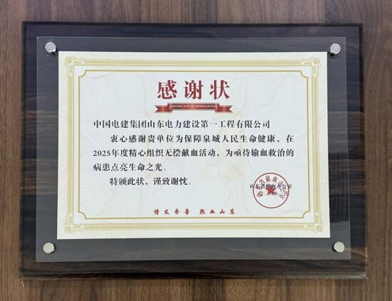 近日,山东省献血办公室向公司颁发感谢状,对公司大力支持社会公益事业、精心组织无偿献血活动、助力泉城人民生命健康的热忱奉献,致以诚挚谢意。